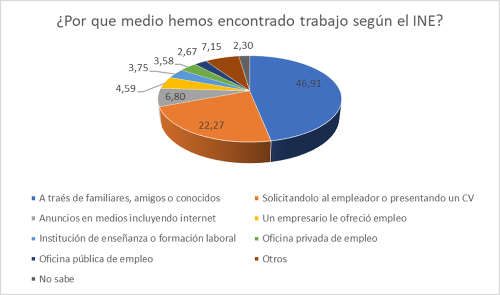 Buscar trabajo es un trabajo en sí mismo, de este modo, así que nos centraremos, tal y como nos dice el Instituto Nacional de Estadística principalmente en la posible red de contactos del usuario, en la presentación de candidaturas espontáneas a empresas dentro de los intereses del usuario y los anuncios en los distintos medios, especialmente en internet.